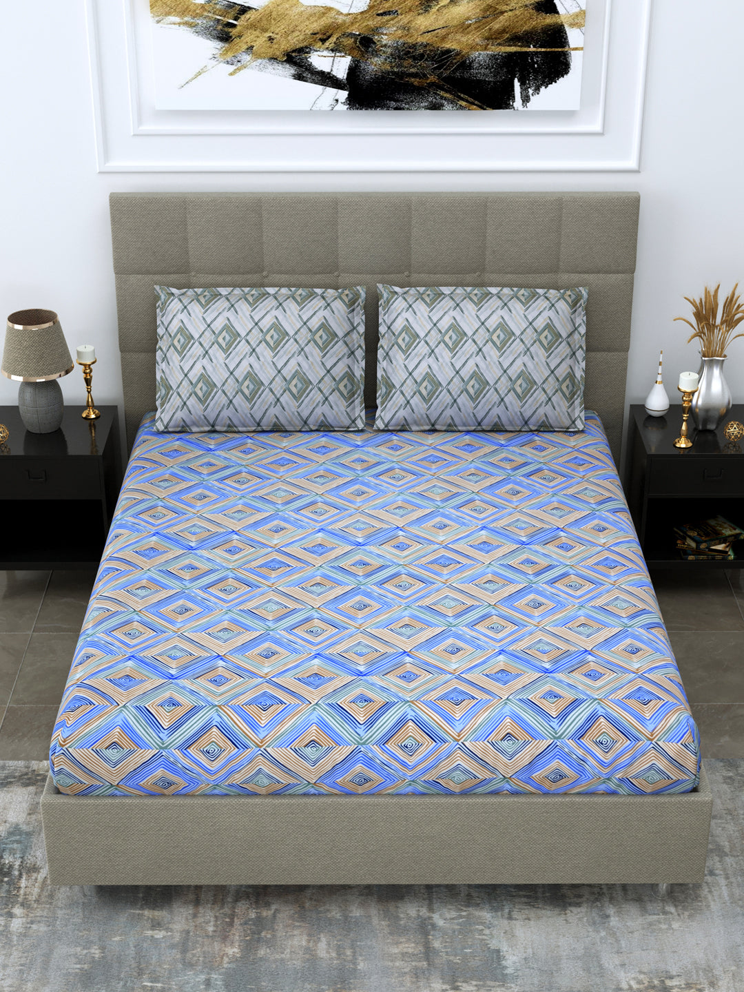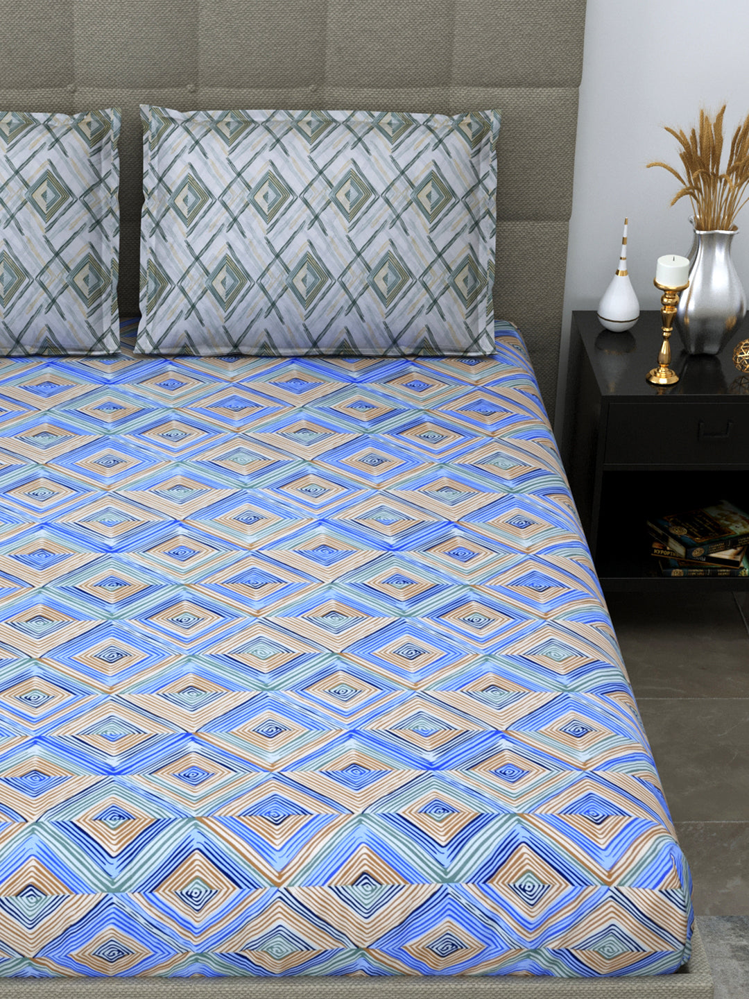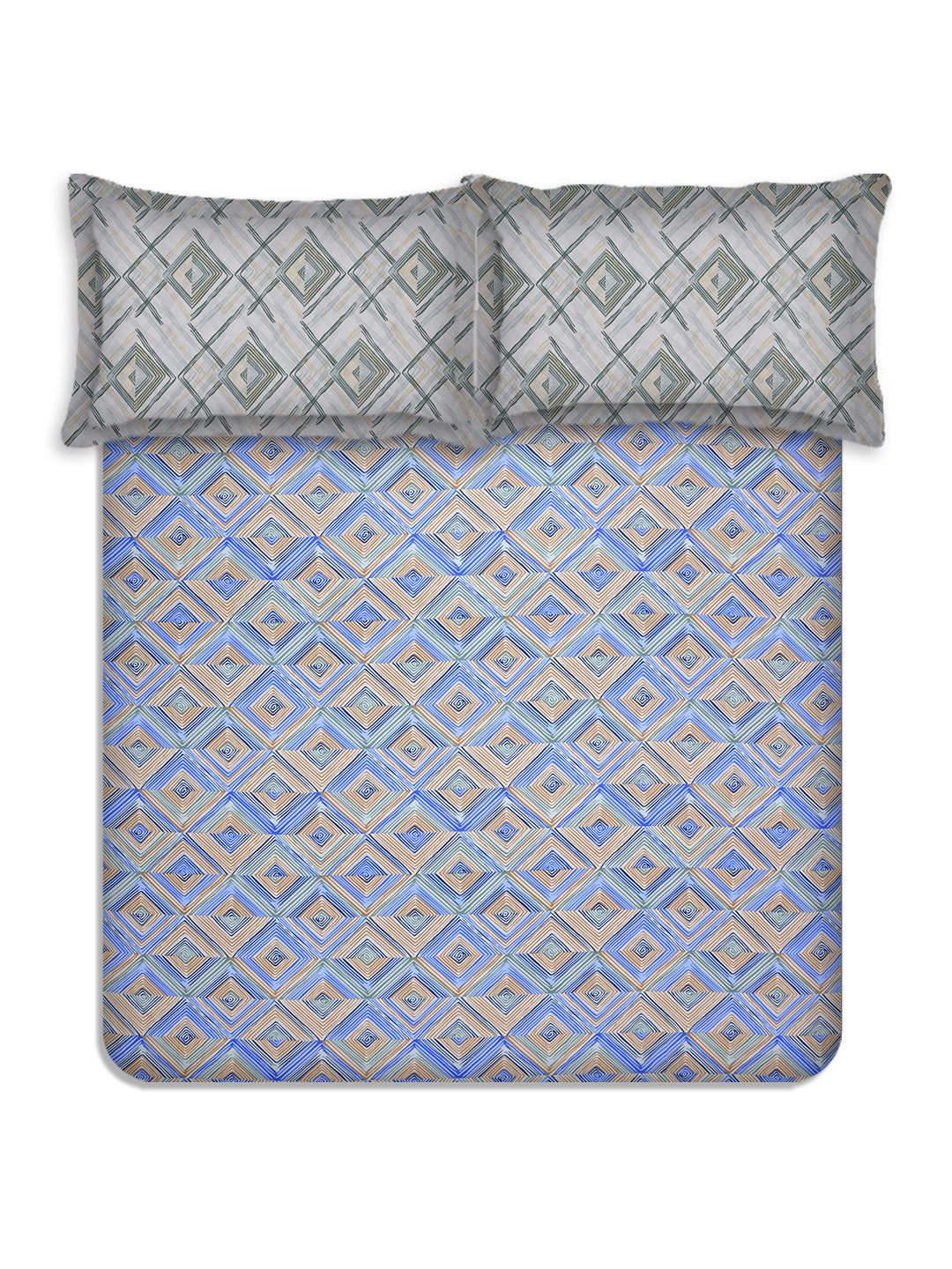 Blue & Brown Geometric Print King Size Fitted Bedsheet with 2 Pillow Covers